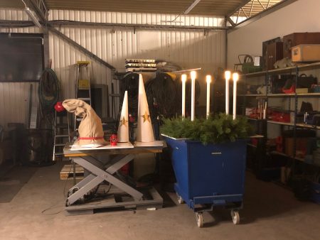 Utsmyckningen är tillverkad helt enligt vår vision, Tillsammans skapar vi en hållbar framtid. Exempelvis är Luciakronan gjord av delar från såväl VA, bredband, laboratoriet och elnät – återbruk när det är som bäst! Det har skapats och fixats i vår verkstad den senaste tiden och vi är stolta och glada över den uppfinningsrikedom och klurighet som finns bland våra medarbetare.